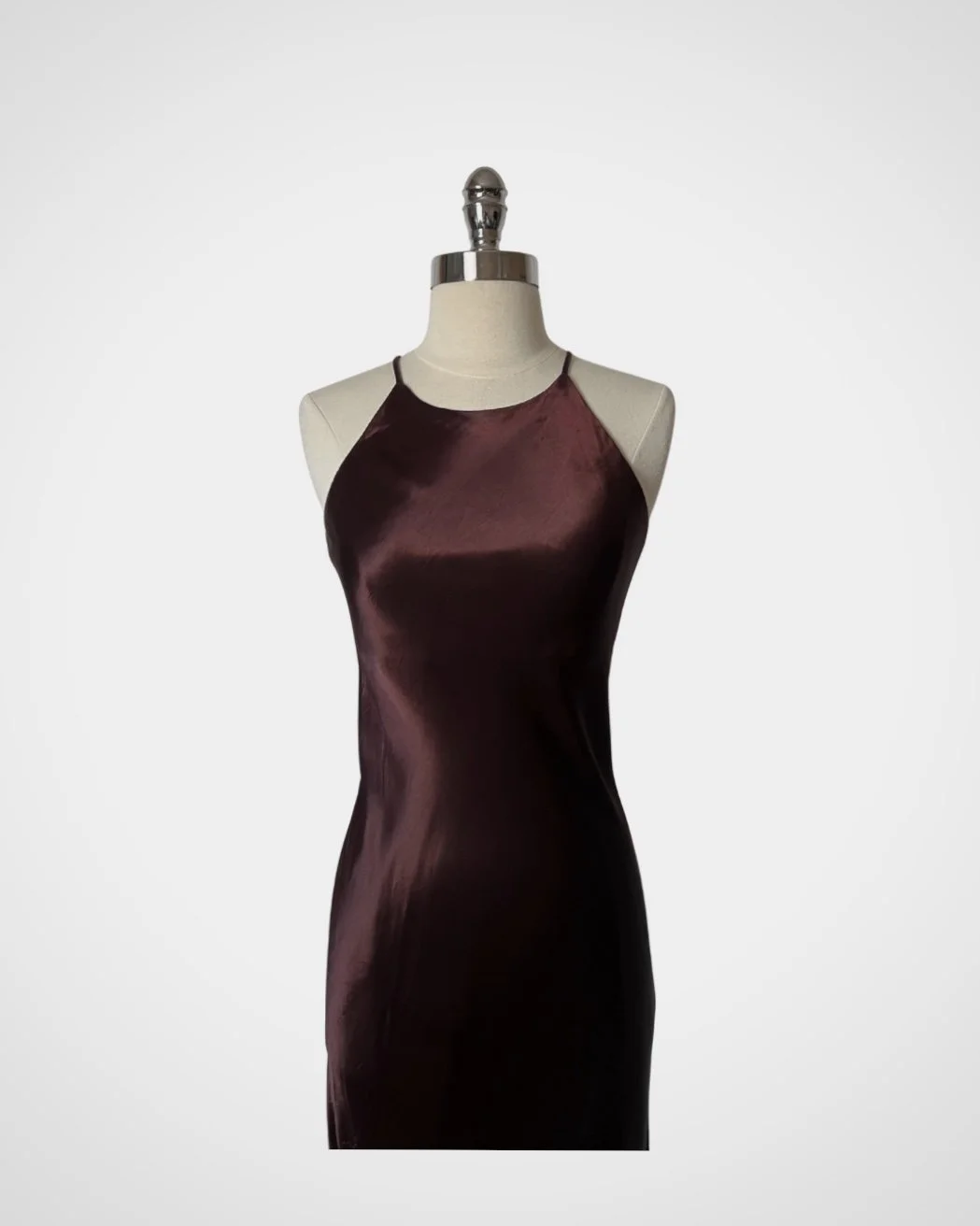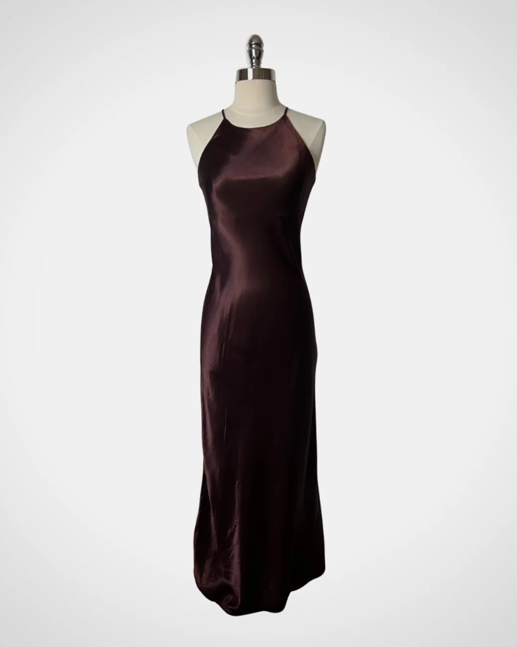 Full length maxi dress intended to fit the floor. Double lined at chest. heavyweight satin weave. Burgundy colour.